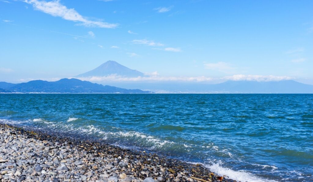 To the north lies the majestic Mount Fuji, and to the south, the deep Suruga Bay and the vast Pacific Ocean.